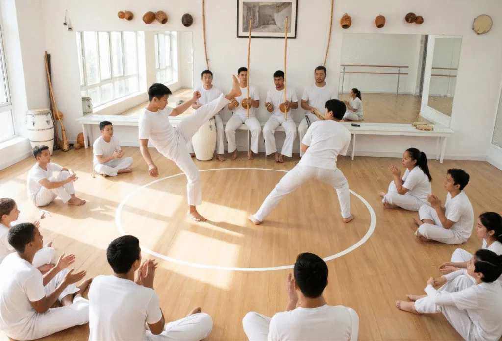 - Acrobatics (Floreios): Learning to move your body through space with flips, carts, and handstands (step-by-step!).